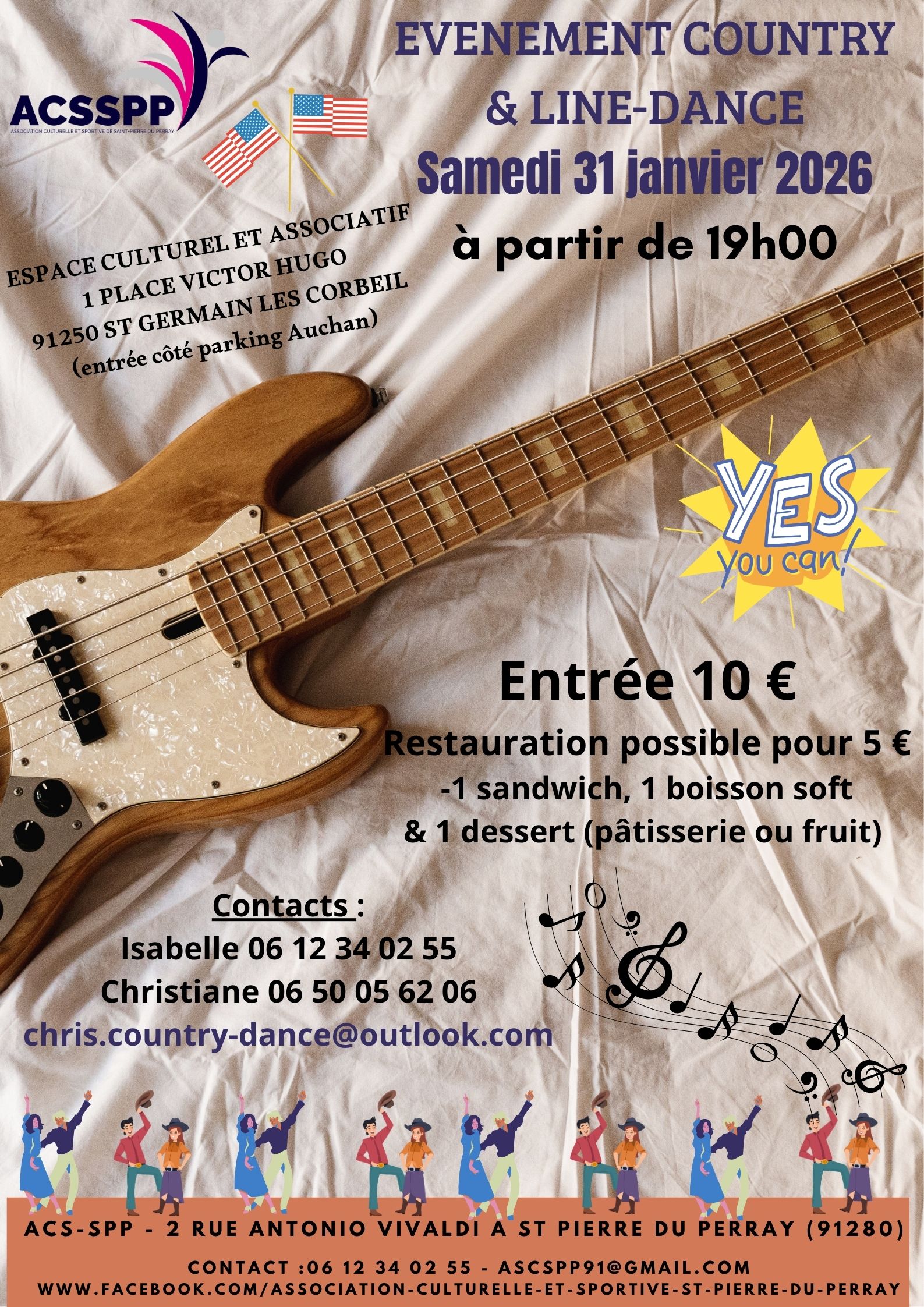 L’ACSSPP organise pour le 1ère fois un bal country, samedi 31 janvier 2026, à partit de 19h, Espace culturel et associatif (1 place Victor Hugo, Saint-Germain-lès-Corbeil). Les inscriptions sont d’ores et déjà ouvertes : vous trouverez ci-joint le bulletin d’inscription à télécharger.